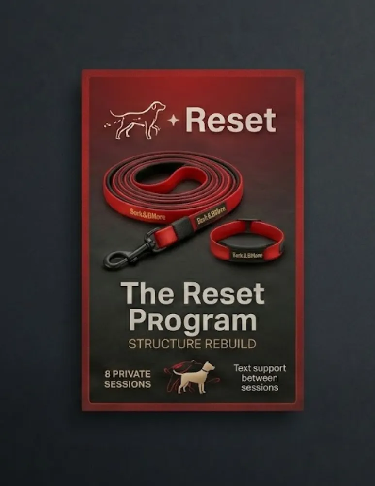 For households that feel out of rhythm, the Reset Program rebuilds structure from the ground up. Over eight private sessions, we install clear rules, structured walk protocols, and consistent follow-through so your dog stops improvising leadership.